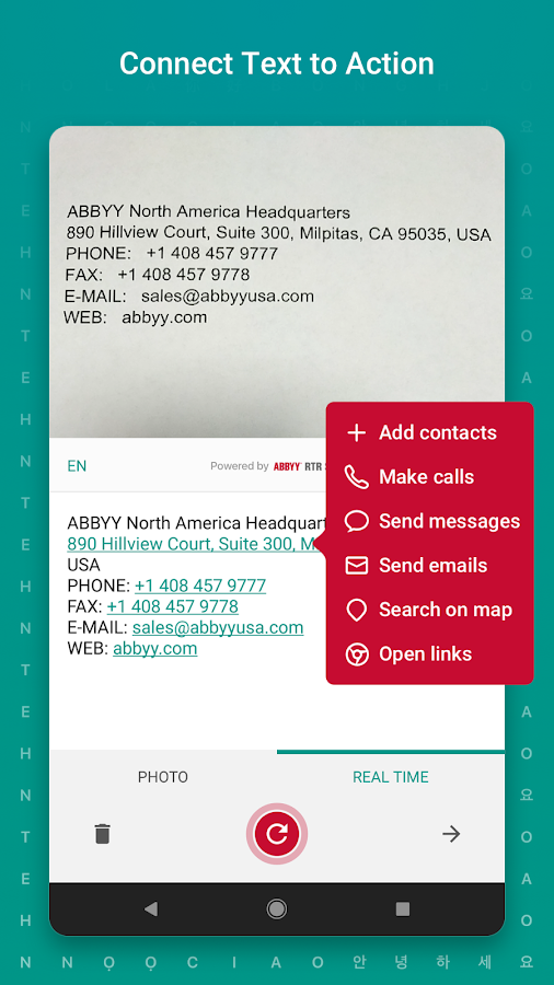 - Innovative Real-Time Recognition mode based on ABBYY RTR SDK technology will digitize printed text directly on the camera screen without taking photographs.