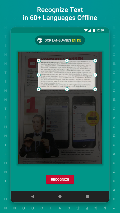 - Text recognition in 60+ languages, including Russian, English, German, Spanish, Greek, Turkish, Chinese and Korean, without an Internet connection (offline on device).
